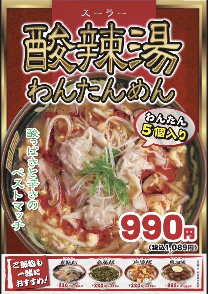 10月1日(水)より新商品「酸辣湯わんたんめん」が販売されます。