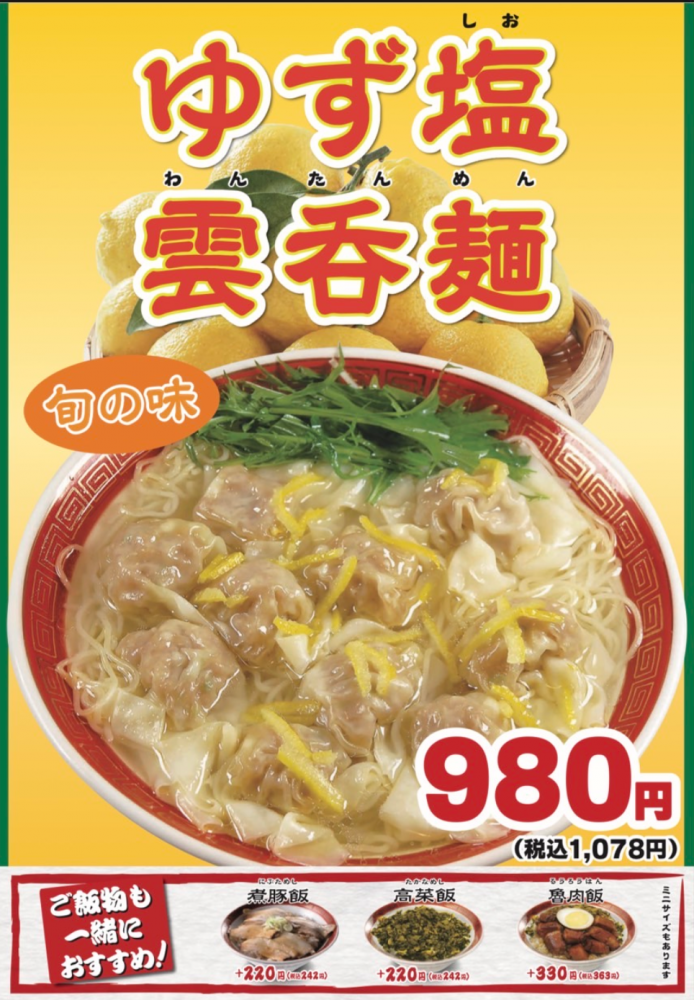 本日より、新商品「ゆず塩雲呑麺」が販売開始となります!