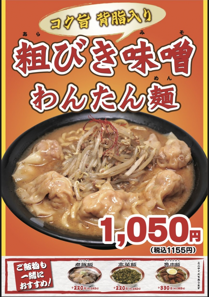 1月3日(土)より、新商品「粗びき味噌わんたん麺」が発売されます。